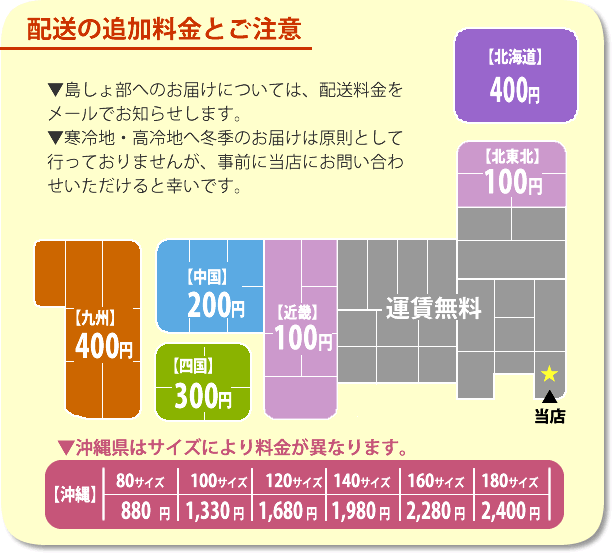 千葉県から発送いたしますが、遠隔地に付きましては下図の通り別途追加料金を申し受けます。
